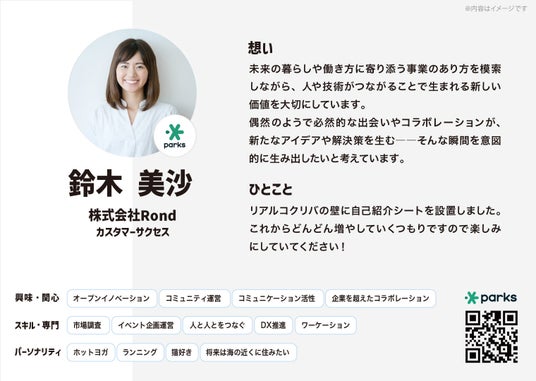 - プロフィールカード掲載:parks上のプロフィール情報をもとに紹介カードを作成し、施設内に掲示しています。カードに記載されたQRコードを読み取ることで、各メンバーのparksプロフィールページにアクセス可能です。これにより、オンライン・オフラインを問わず、会員同士が互いのことを知るきっかけを提供します。