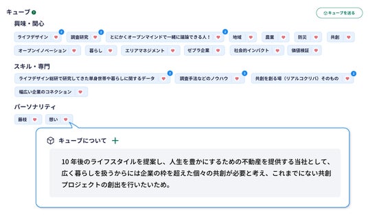 - AI検索:メンバー自身が「つながりたい相手」を見つけ、自らアクションを起こすことで、共創につながる出会いを生み出します。