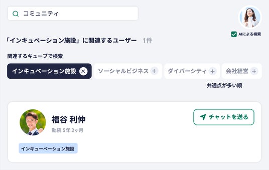 ▲parksのAI検索にて「コミュニティ」を検索した結果、「インキュベーション施設」を運営した経験者がヒットした