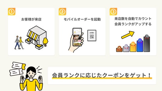 このたび、新たにリリースした会員プログラム機能は、再来店促進やお店のファン作りをサポートするサービス「POS+ CRM(ポスタス シーアールエム)」の機能であり、モバイルオーダーを起動すると、来店回数を自動でカウントアップし、来店回数に応じた会員ランクと、会員ランクに応じたデジタルクーポンを付与します。