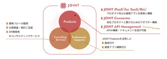 SaaSベンダーやエンドユーザーがSaaS提供・活用する際に “データ連携を意識しなくていい世界” を実現するJOINTシリーズは、「JOINT iPaaS」を含む【Product】【Consulting Service】【Professional Supports】の3つから構成されます。