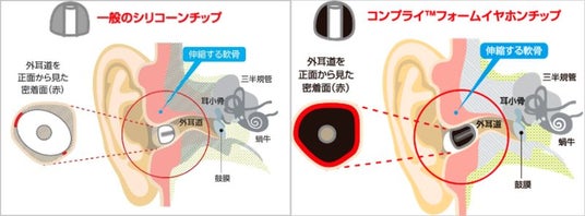 一般のシリコーン製イヤーピースや他社イヤーピースは硬さが一定で体温による順応性は無く、外耳道とイヤーピースの間に多くの隙間ができるため、音漏れやズレが生じやすく、音質の低下や耳の痛みの原因となります。COMPLY(TM)製品の最大の特徴でもある「低反発ポリウレタン」はシリコーンより30倍柔らかく、順応性が高いため、体温に反応して着用する人それぞれの耳の形、口の開閉による顎の骨の動きに合わせてフィット、他社商品には無い究極の密着性を実現します。働き方が大きく変わりオンライン会議が定着した現代では、長時間快適に使用できるイヤホンは欠かせません。また、吸水速乾性にも優れているため、外耳道の皮膚の自然な呼吸を妨げず、菌の繁殖なども防ぎ外耳道炎のリスクも極限まで低減されます。
