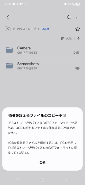 FAT32では、ファイル1つあたりの容量が最大4GBまでとなっている。写真のデータは通常数MB程度の容量なので問題なく転送できる。対して動画のデータ、それも4Kや8Kといった高画質動画では、あっというまに4GBを超えてしまい、転送できなくなってしまうのだ。実際に、容量4GB超のデータを転送しようとしても、警告メッセージが表示されて転送できない。