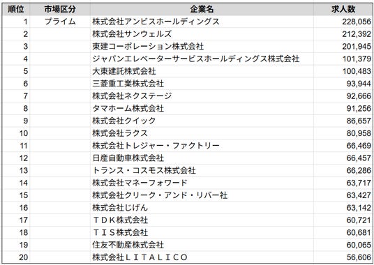 株式会社SalesNow(本社:東京都渋谷区、代表取締役:村岡功規、以下「当社」)は、国内540万社の企業情報を完全網羅した日本最大級のデータベース「SalesNow DB」より、プライム市場に上場する企業の求人数ランキングを集計しました。