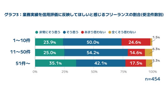 また、受注実績が多い層ほど業務実績を信用評価に反映してほしいという強い期待を持つ傾向にあります。受注件数51件以上の層では「非常にそう思う」が35.1%に達するのに対し、1~10件の層(23.9%)を大きく上回っています(グラフ3)。実績を積み重ねたフリーランスほど、不動産やクレジットカードなどの信用評価システムと自己の実績との間にギャップを強く感じていることを示唆しています。