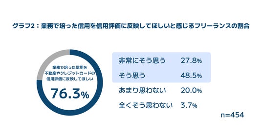 フリーランス向けの調査で、「フリーランスは不動産やクレジットカード等の審査で不利だと感じることはあるか」という質問では、「非常にそう思う」(25.1%)と「そう思う」(39.2%)を合わせて64.3%となり、現在の信用評価システムに対する不満を抱えている人が多いことがわかります(グラフ1)。同時に、「業務で培った信用を不動産やクレジットカードの信用評価に反映してほしいか」という質問では、「非常にそう思う」(27.8%)と「そう思う」(48.5%)を合わせて76.3%が肯定的に回答しており、キャリアや実績を適切に評価する新たな仕組みへの期待が高いことがわかります(グラフ2)。