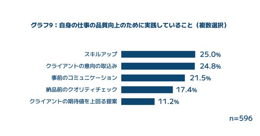 一方で、フリーランス向けの「自身の仕事の品質向上のために実践していることは」という質問に対して、最も多かった回答は「スキルアップ」((グラフ9)。フリーランスは、発注者が重視しているコミュニケーションはもちろん、仕事の実績に繋げるためのスキルアップにも力を入れていることがわかります。