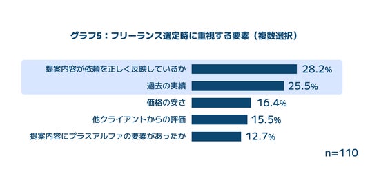 発注者向けの調査で、「過去に発注したフリーランスの満足度」では95.4%が「満足」と回答しており、満足度は極めて高い水準でした(グラフ4)。フリーランスを選定する際には、「提案内容にプラスアルファの要素があること」や「過去の実績」などを特に重視していることもわかりました(グラフ5)。