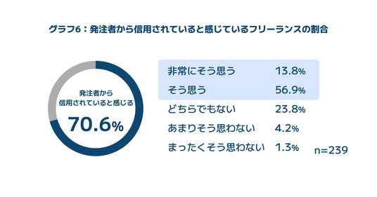 なお、フリーランス向けの調査でも、フリーランスの70.7%が「信用されている」と実感しています(グラフ6)。特に「コミュニケーション」に関する要素が、双方の満足度向上につながっていることが示唆されました。