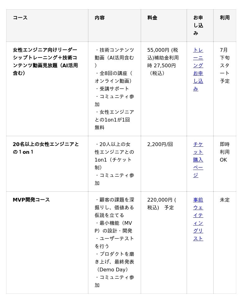 ▶︎講座内容:女性エンジニア向けリーダーシップトレーニング全8回に加え、AI活用含む技術コンテンツ動画見放題!