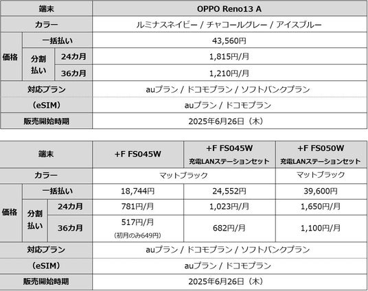 mineo新端末「OPPO Reno13 A」「+F FS045W」「+F FS045W充電LANステーションセット」「+F FS050W充電LANステーションセット」の販売開始について