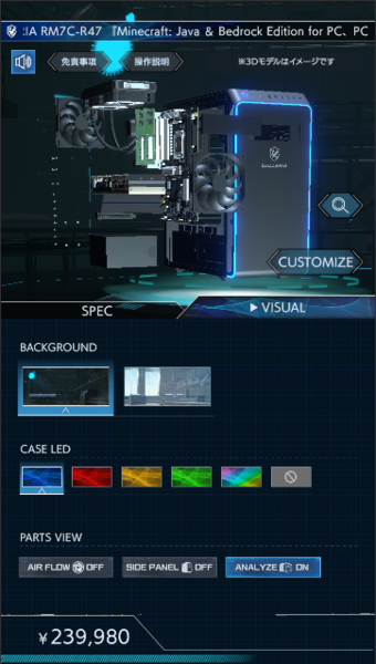 「3Dカスタマイズシミュレーター」は、選んだパーツによってパソコンの内部がどのように変化するかを視覚的に確認することができるサービスだ。筐体を360度回転させたり、内部をズームしたり、ケース前面のLEDカラーを変えたりと、細部までカスタマイズ可能だという。また、空気の流れを可視化できるエアフロー機能も搭載しており、冷却性能を視覚的に確かめることができる。
