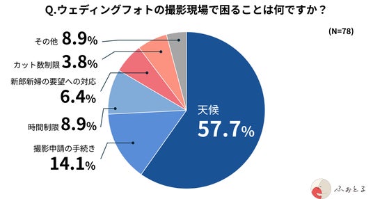 - ウェディングフォトの課題は「天候」が群を抜いて多く58%、次に「撮影申請などの手続き」が14%。
