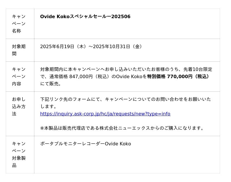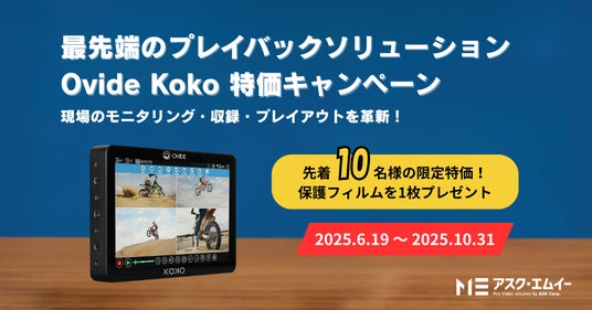株式会社アスク(本社:東京都千代田区)は、2025年6月19日(木)から 2025年10月31日(金)までの期間限定で、ポータブルモニターレコーダー『Ovide Koko』を対象とした特別キャンペーン【Ovide Kokoスペシャルセールー202506】を実施いたします。