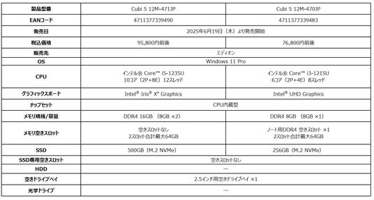 この度、エムエスアイコンピュータージャパン株式会社は2025年6月19日(木)より業務効率と設置自由度を兼ね備えたビジネス&ホームユース向けミニPCを2機種同時発売いたします。「Cubi 5 12M-471JP」は、高性能なCPUとメモリ・ストレージ容量を備え、マルチタスクなど負荷の高い作業にも対応可能です。一方、「Cubi 5 12M-470JP」は、コストパフォーマンスを重視したエントリーモデルとして、日常業務や軽作業に最適です。