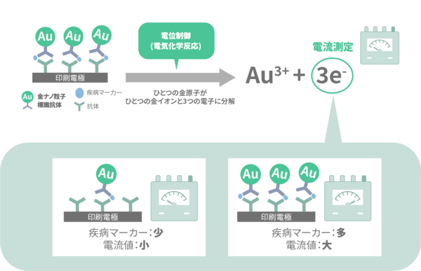 そしてもうひとつ、金ナノ粒子を使った免疫センサーという方法もある。金ナノ粒子は、特定の分子と反応すると色が変わるという性質があり、変化を目で見て確認できる。簡易検査キットなどに活用されることが多く、構造がシンプルでコストも抑えられるため、現場や家庭での“その場チェック”に向いている。