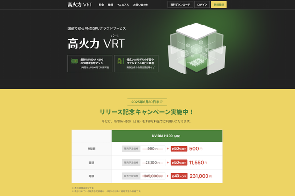 さくらインターネットでは2025年春から、H100を搭載した仮想マシンをネット経由で利用できるサービス「高火力VRT」の提供を開始。本キャンペーンは、そのリリースを記念したものだ。