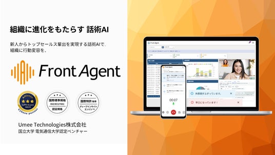 ユミーは、対面、WEB会議、電話、あらゆる商談をリアルタイムで解析し、組織に進化をもたらす話術AI「Front Agent」の紹介をいたします。新人がトップセールスへと飛躍する、AI活用よる『人材マネジメント』 新人が1か月でトップセールスの売り上げを2倍で超えた事例も。現場は録音/ 録画するだけで、再現性ある「人材育成マネジメント」が可能になります。