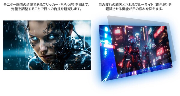 ほかにも、JN-IPS238G120F-C6の魅力は2W×2のステレオスピーカーやフリッカーフリー、ブルーライト軽減機能などたくさんある。その多くは、「OSDメニュー」から設定できる。