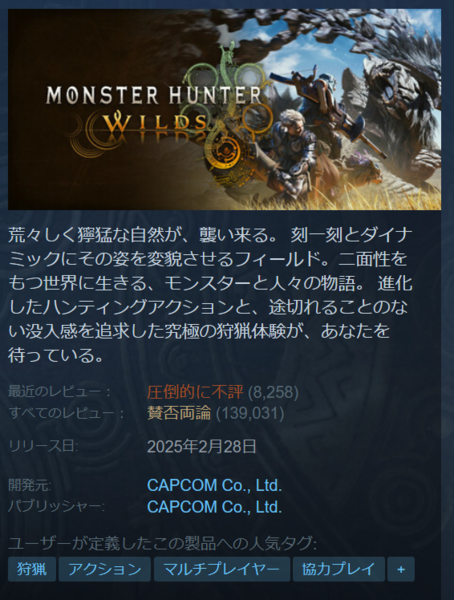 カプコンが2025年2月28日に発売した「モンスターハンターワイルズ」。発売から1ヵ月で全世界販売本数1000万本を達成するなど、記録的な大成功を収めた本作に異変が起きている。Steamの評価が“圧倒的に不評”となっているのだ。