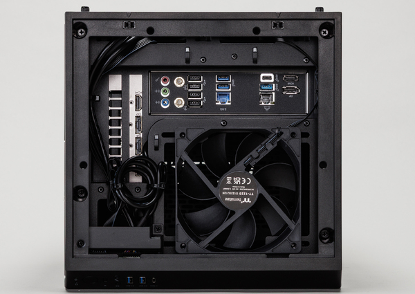なぜかというと、マザーボードが横向きに装着されているため、通常背面にくるはずのインターフェースと外部出力が上にあるからだ。外部出力ケーブルや有線LAN、電源ケーブルも上に来るため、設置場所によってはより長いケーブルを用意する必要があるかもしれない。しかし、天面からケーブルが出るわけではなく、背面上部にケーブルを通す隙間があるので、見た目的にケーブルがごちゃっとすることがないのはありがたい。