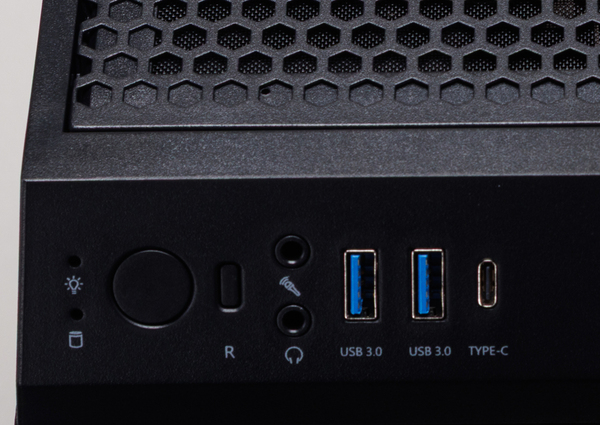 前面インターフェースは、USB Type-A×2、USB Type-C、マイク入力、ヘッドフォン出力がある。Type-C端子があるのはうれしいポイントで、ここによく着脱するワイヤレスヘッドセットといった2.4GHzドングルなどを差すことをオススメしたい。