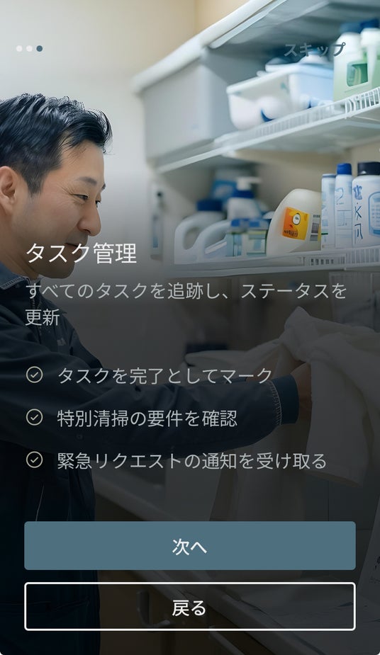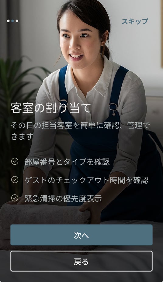 - PMS(宿泊管理システム)連携による自動タスク配信チェックアウト情報をもとに清掃タスクを自動割り当て