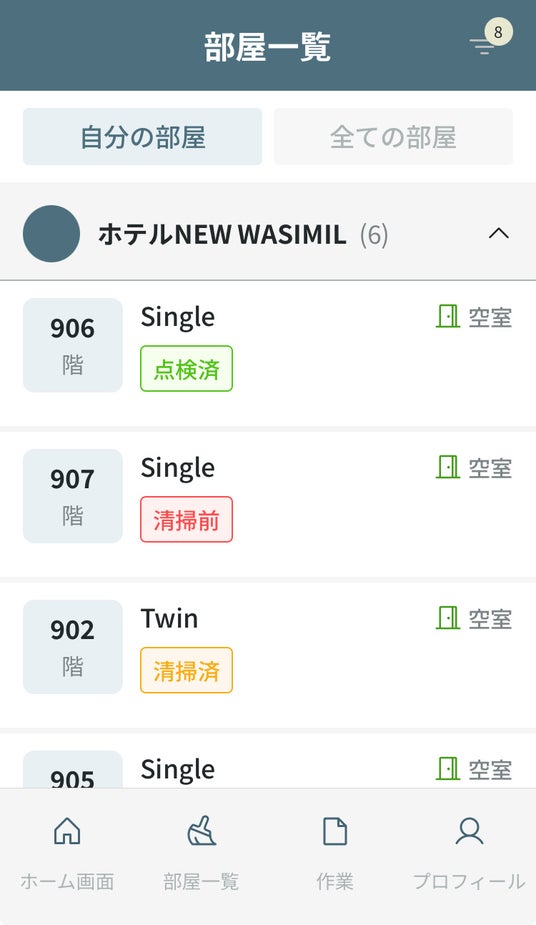 - 部屋割りと作業一覧の自動表示担当者は自分の割り当て部屋数と状態(清掃前・清掃済・点検済)を確認・更新可能