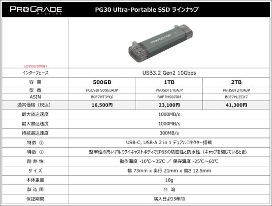 ProGrade Digital Incは、USB-C/Aデュアルコネクター搭載アルミダイキャストボディのPG30 Ultra-Portable SSDを3種類の容量ラインナップ(500GB/1TB/2TB)で販売を開始しました。税込価格は 500GB 16,500円 1TB 23,100円、2TB 41,300円円です。