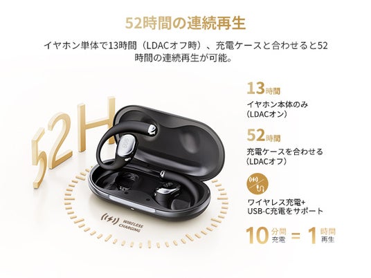 - 最大52時間再生可能(ケース込み)/ 単体で13時間連続再生可能(LDACオフ)