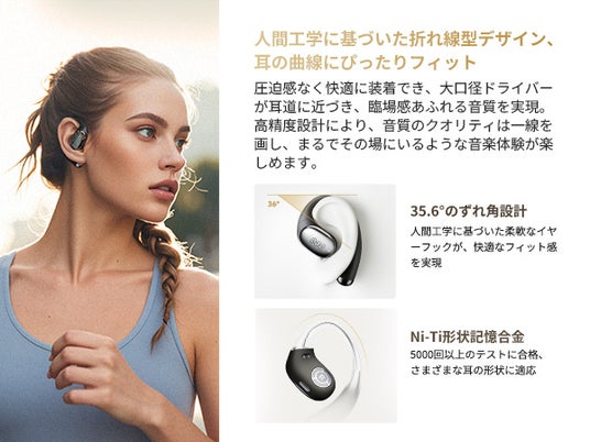 耳穴を圧迫しないオープンイヤー構造で、ランニングやジムトレーニング中でも周囲の音を認識可能。