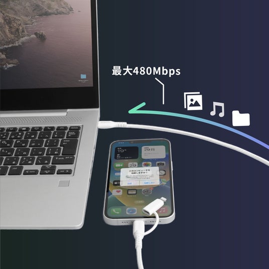 USB Type-C、Lightning対応機器で使える2 in 1ケーブル本製品はUSB Type-Cポート搭載機器で使える、2 in 1ケーブルです。通常時はUSB Type-C to Cケーブルとして、Lightning変換アダプターを装着すれば、USB Type-C to Lightningケーブルとしてお使いいただけます。