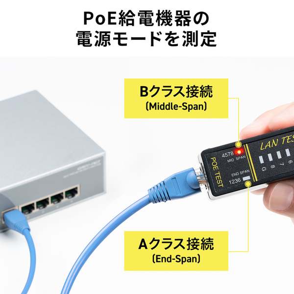 本製品には、PoEチェッカー機能も搭載しており、PoE機器の電源モード(Aクラス/Bクラス)を簡単に判別できる。ネットワークカメラやアクセスポイントなど、PoE対応機器の設置時やトラブル時にも役立つ機能だ。これにより、PoE環境の確認作業が一台で完了できるという。
