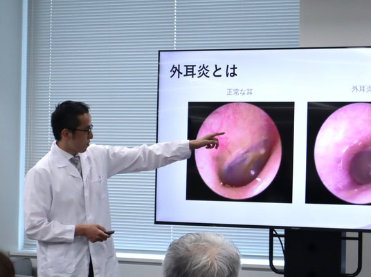 特に、プールや海で泳ぐ際には、耳に水が入ることがあります。水が入ると耳垢が水分を吸収して膨張し、耳が詰まったような感じや、音がこもって聞こえる場合があります。また、清潔ではない水が耳に入ることで、細菌感染を起こしやすくなります。』 その他、 補聴器の使用、アレルギー性皮膚炎、整髪料などの刺激についても解説いただきました。