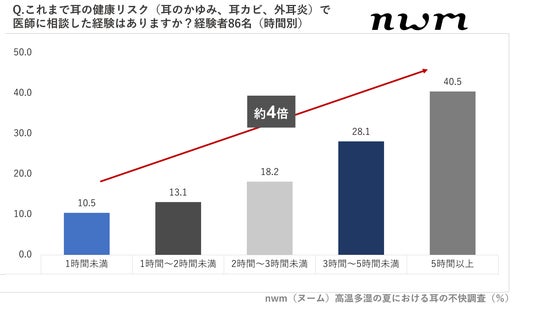 『夏は“外耳炎”や“耳カビ”の患者数が増加します。とくに多いのは「イヤホンの長時間利用」です。イヤホンを5時間以上使用している方は、使用時間が少ない方に比べ、外耳炎や耳のカビ、耳のかゆみなどの症状が出ることが約4倍になるとされています。ほかの原因として、「過度な耳掃除」や、この時期特有の「高温多湿な環境」も挙げられます。』