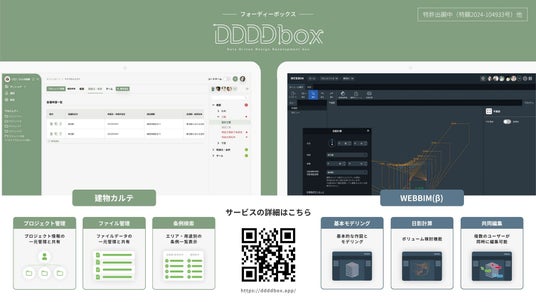 DDDDboxは、本特許に関係する「条例検索機能」(建物の住所を入力するだけで、各自治体の条例を自動で検索・確認できる)のほか、ボリューム作成、生成機能により、企画・基本設計段階での検討高速化を目指す「WEBBIM」など、建築意匠設計に関する業務効率化を支援する様々な機能を持ちます。