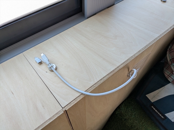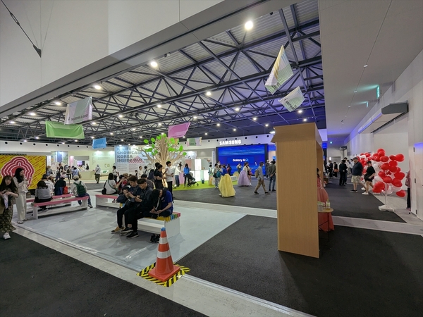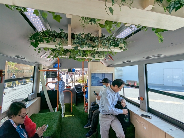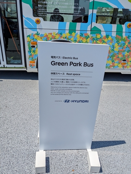 場内にヒョンデのEVバスを発見。これは休憩施設として使われており、日よけのある休憩施設が少ない会場内ではとてもうれしいサービス。さらにバスの電気でスマホの充電をするサービスも行なっており、何でもスマホな会場では大変にありがたいものです。バスの中には人工芝が敷き詰めらているのもユニーク。