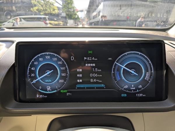 充電量89%で出発。静かでパワフル。ちょっとフワッとした乗り心地に感心しながら、大阪の街を走ります。ナビも日本語のローカライズができており、まったくもって不安ナシ。途中、道を間違えながらも、阪神高速に乗り、京都を抜けて滋賀県へ。