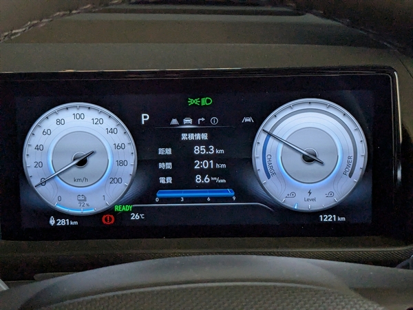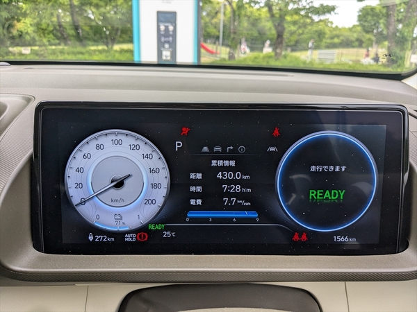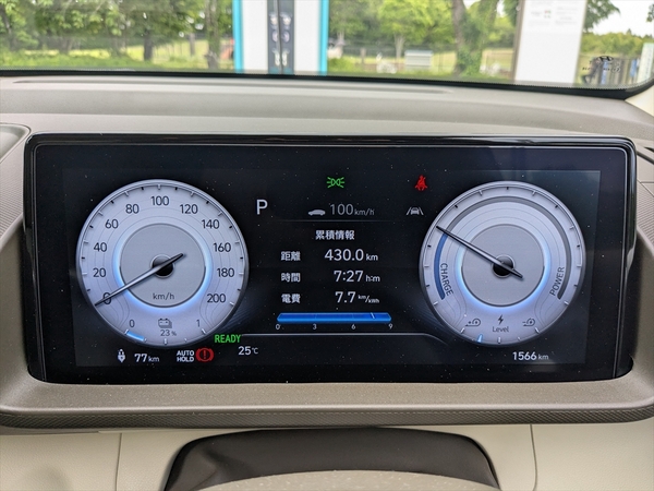 15時過ぎに「Hyundai Customer Experience Center 横浜」に到着。大阪から走行だけで8時間半、休憩を入れると9時間30分。残量56%で到着できました。電費は約8km/kWhと良い数字でした。さすがに疲れましたが、それでもほかのクルマで鈴鹿から帰った時に比べれば、疲労度は少なかったですね。