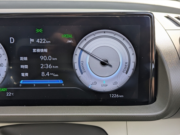 16時までに「Hyundai Customer Experience Center 横浜」に到着せよ、と言う話だったので、朝8時にホテルを出たのですが、通勤時間帯と重なり大渋滞に巻き込まれました。そこでアクセルペダルの加減だけで速度がコントロールできる、ワンペダル動作モード(i-PEDAL)へと変更。これが渋滞にはとても有効。完全停止もするので、ブレーキペダルいらずです。
