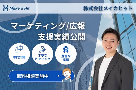 株式会社メイカヒット(本社:[東京都目黒区鷹番3丁目14-4 メゾンマークワン403]、代表取締役:[久保田 亮]、以下 メイカヒット)は、お客様の事業に深く寄り添い、丁寧なヒアリングを通じて本質的な課題を発見し再現性の高いマーケティング・広報戦略を実行することで、事業成長の「最短ルート」を共に描き出すことを使命としています。