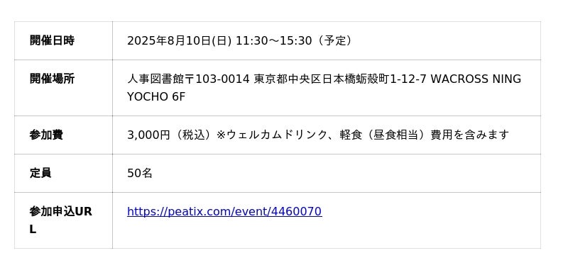 生成AIの活用が企業経営の重要テーマとなる中、人と組織の専門家である「人事」に寄せられる期待は日に日に高まっています。本イベントは、AI活用に課題や可能性を感じる人事担当者が集い、対話を通じて学び合う場です。会社で人事職についている方、人事の仕事に葛藤を抱えている方や、関心のある方でしたらどなたでも参加申込ページより参加申し込みいただけます。ぜひお越しください。