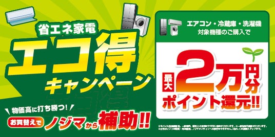 株式会社ノジマ(神奈川県横浜市、代表執行役社長・野島廣司、以下「ノジマ」)は、6月23日(月)より、省エネ家電へのお買い替えで最大2万円分のポイント還元を行う「エコ得キャンペーン」を実施いたします。今、家電量販店で省エネ家電お買い替えの補助をしているのはノジマだけ※!
