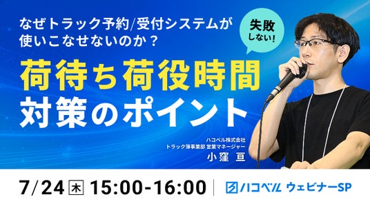 物流プラットフォームを展開するハコベル株式会社(本社:東京都中央区、代表取締役社長CEO:狭間 健志、以下:ハコベル)は2025年7月24日(木)、トラック予約/受付システムに関するウェビナーを開催することをお知らせいたします。