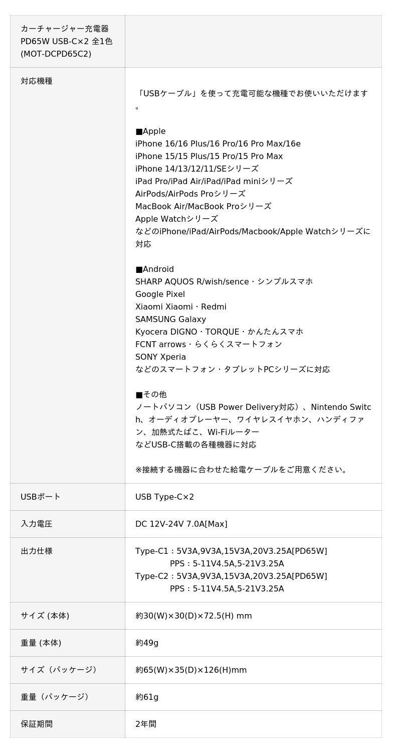 USB車載充電器(カーチャージャー) PD65W USB-C×2 急速充電 12/24V 普通車 トラック両対応 全1色 2年保証(MOT-DCPD65C2)