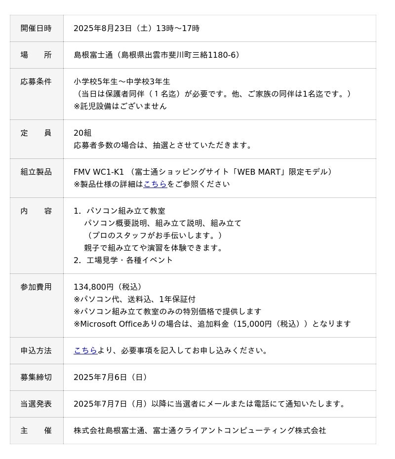 富士通クライアントコンピューティング株式会社(本社:神奈川県川崎市、代表取締役社長:大隈 健史、以下、FCCL)は、株式会社島根富士通(所在地:島根県出雲市、代表取締役社長:宮下 浩之、以下、島根富士通)と共同で、小中学生を対象とした「第18回富士通FMVパソコン組み立て教室」を8月23日(土)に島根富士通にて開催します。