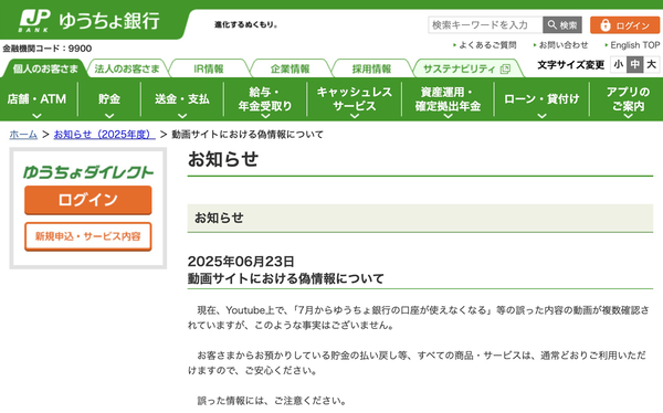 【注意】ゆうちょ銀行をかたる偽情報がYouTubeで拡散中 「口座は通常通り利用可能」