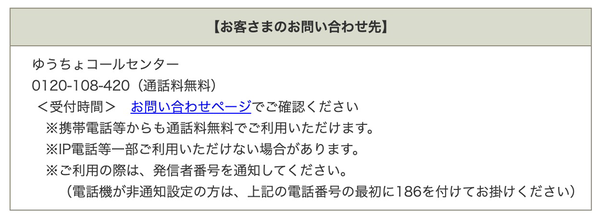 ゆうちょ銀行は「誤った情報には、ご注意ください」と改めて注意を促しており、不明な点がある場合は、ゆうちょコールセンター(0120-108-420、通話料無料)へ問い合わせるよう案内している。携帯電話からも通話料無料で利用できるが、IP電話など一部利用できない場合がある。問い合わせの際は、発信者番号の通知が必要となる。