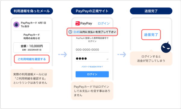 紹介されているフィッシング詐欺の一例を挙げると、まず、架空の利用明細を記したフィッシングメールが送られてきます。被害者が偽メール内の利用明細ボタンをタップすると、本物の公式サイトに飛ばされます。そこでログイン情報を入力してしまうと、記されている金額が詐欺師に送金されてしまうという手口です。