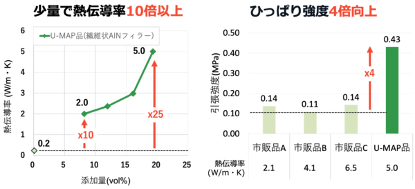 ・従来品に数%添加することで機械強度を4倍に向上。10W/mKを超える熱伝導率でも、液体やペースト状だけでなく、特定の形状を形成することが可能になったとのこと。